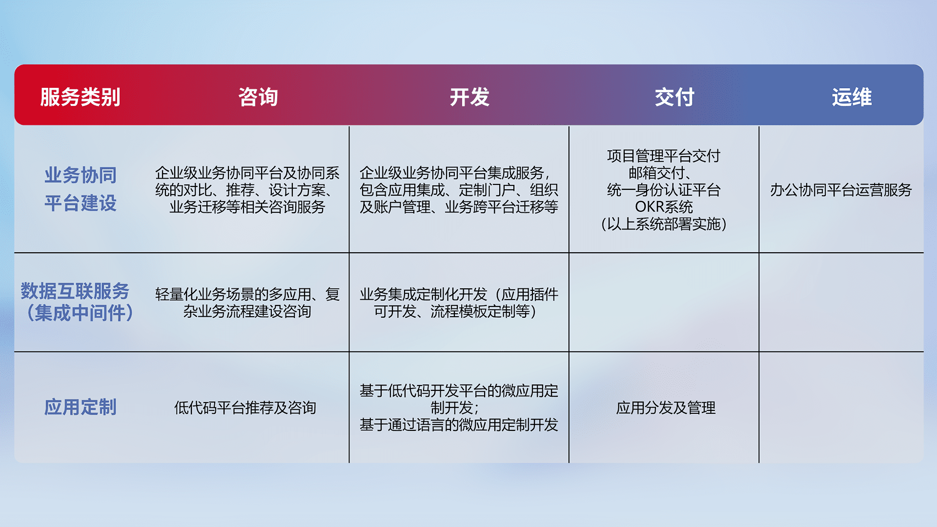 针对钉钉、、企微、、IDaas等平台级产品提供产品的规划、、方案、、、、交付、、、定制化开发等服务,,,实现如统一协同办公、、、、智能客户服务、、、、混合会议管理、、、智能数据查询、、等业务场景,,,,实现数字化转型。。。