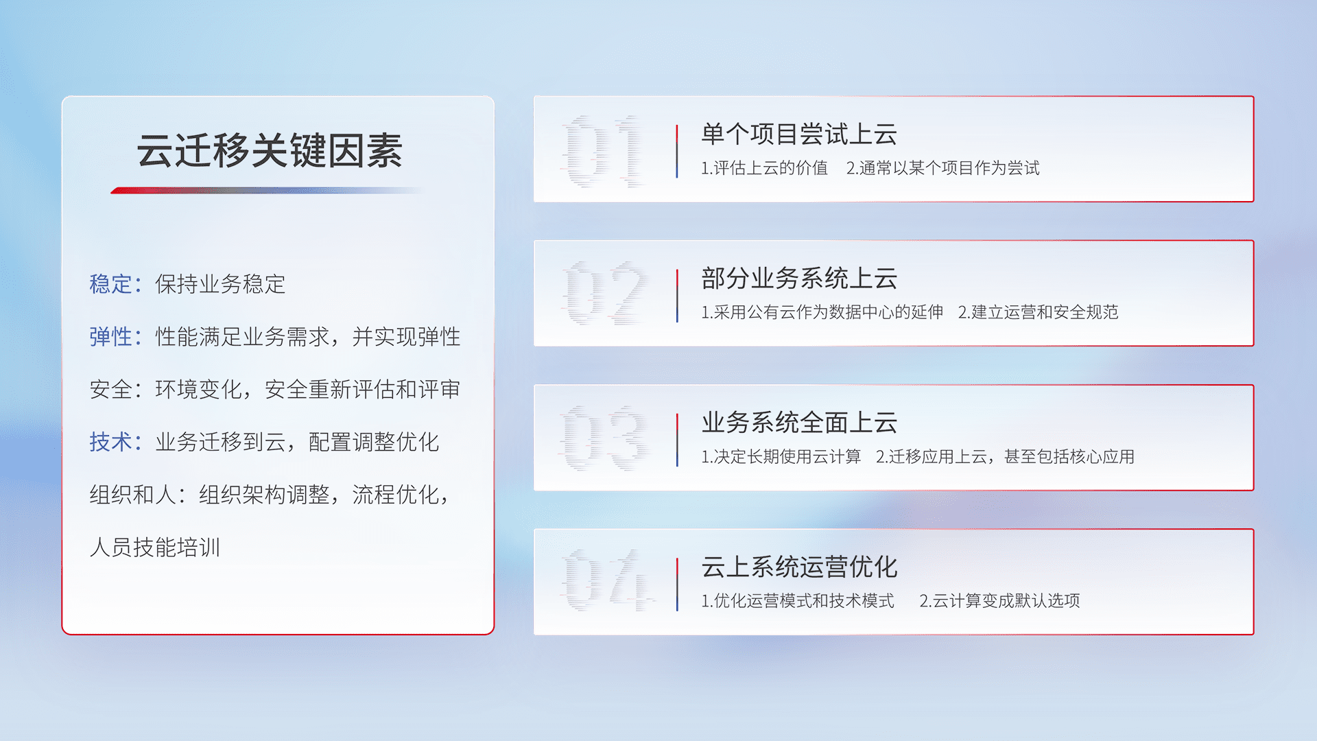 结合实际业务,,,,从规划设计、、云平台选型、、、、云原生改造、、、数据迁移、、集成交付,,迁移全过程为客户识别最佳上云路径,,,做好风险识别管理,,,,设计网络架构、、、身份权限、、、安全审计合规、、、、操作审计、、、、日志审计、、、、监控告警策略、、多站点容灾设计等,,,,对云上基础设施进行整体规划,,提升IT治理水平,,以满足弹性、、、、高可用、、、高性能的需求。。。