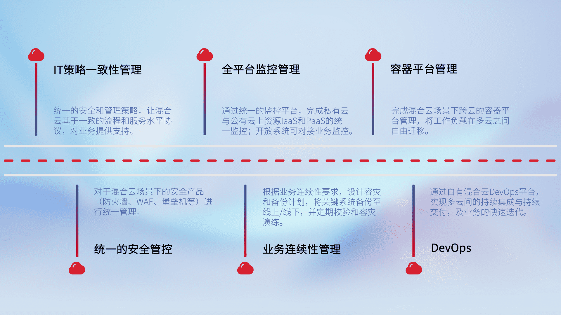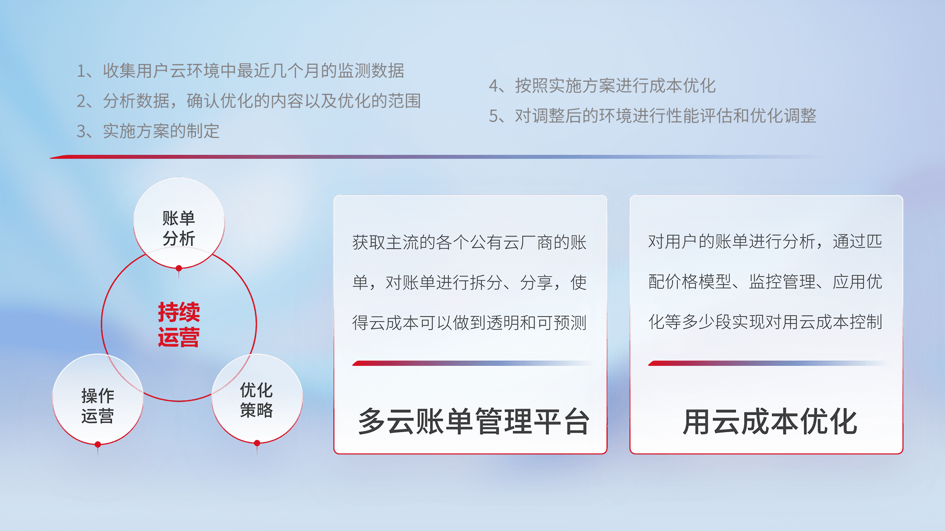 通过多云纳管,,以统一的资源数据模型把客户的云资源进行抽象和封装,,,进而实现对多云资源的统一操作,,保障云资源管理的可靠性、、、稳定性与可用性。。量身定制化运维内容,,,配置、、开发运维、、、、补丁管理、、、备份、、、、监控、、、认证和访问管理、、审计和日常巡检等,,保障在用云过程中的可靠度,,稳定度以及高可用率。。。。
