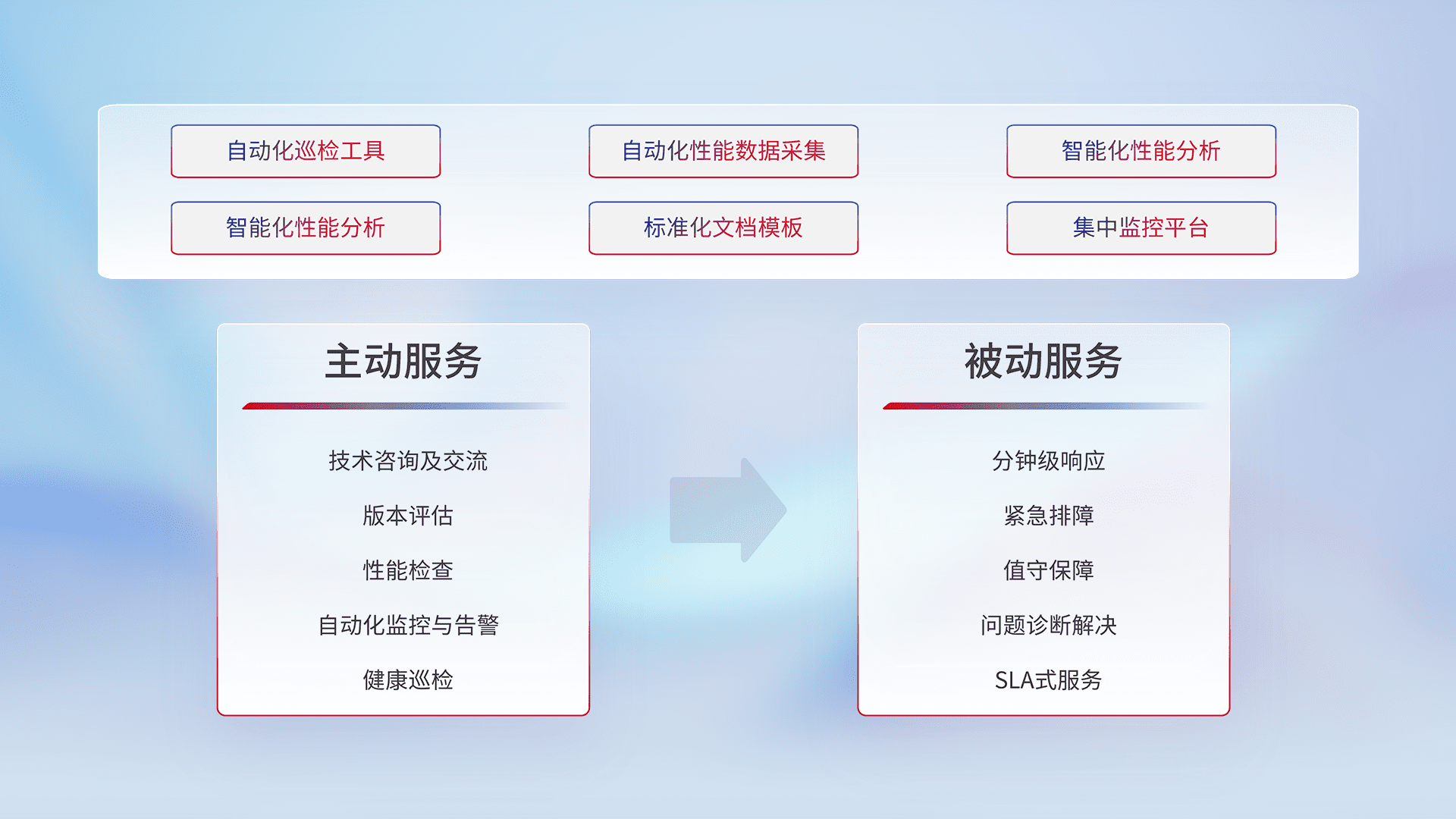 智能化工具和标准化文档,,保障服务质量,,,,提供主动服务(包含技术咨询、、、版本评估、、、、性能检查、、自动化监控与告警、、、、健康巡检)和被动服务包含(分钟级响应、、紧急排障、、值守保障、、问题诊断解决、、、SLA服务)。。。。