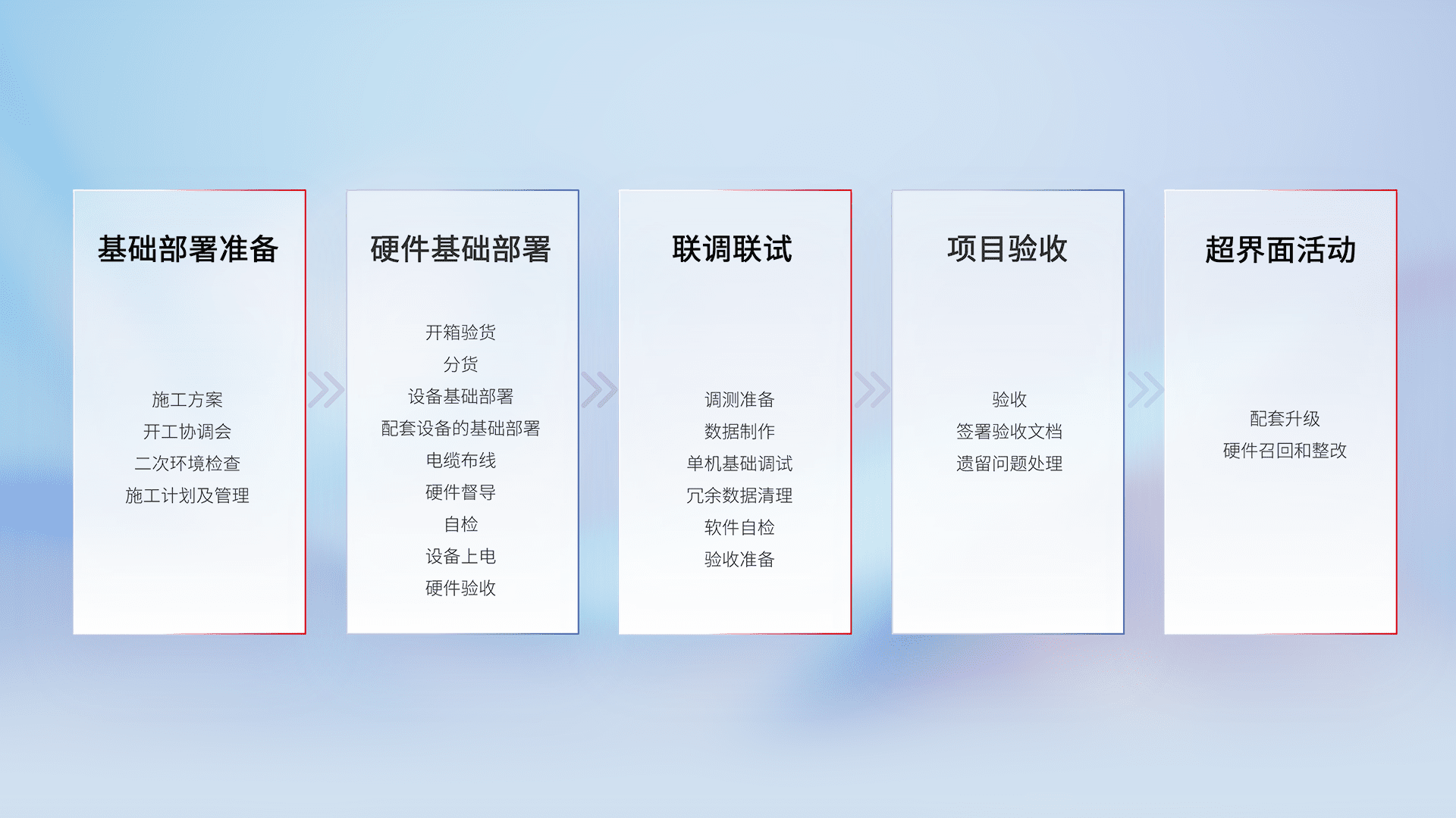 从基础部署准备、、、硬件基础部署、、、联调联试、、、、项目验收、、、、越界面活动的全过程可追溯,,,,保证施工质量和进度。。。